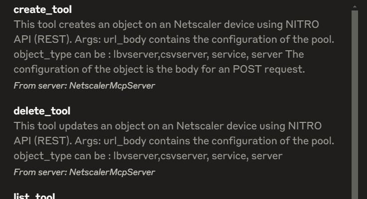 This project is anย MCP( Model Context Protocol ) serverย designed to interact with Netscaler devices using theย NITRO API (REST). It provides a set of tools to manage Netscaler objects such as lbvserver,csvserver, service, and server. The server is implemented using theย FastMCPย framework and exposes functionalities for creating, updating, listing, deleting, binding Netscaler objects, and also looking into ns logs or stats for different objects. It is incredible how easy it is to operate a Netscaler device with an LLM and an MCP server.
